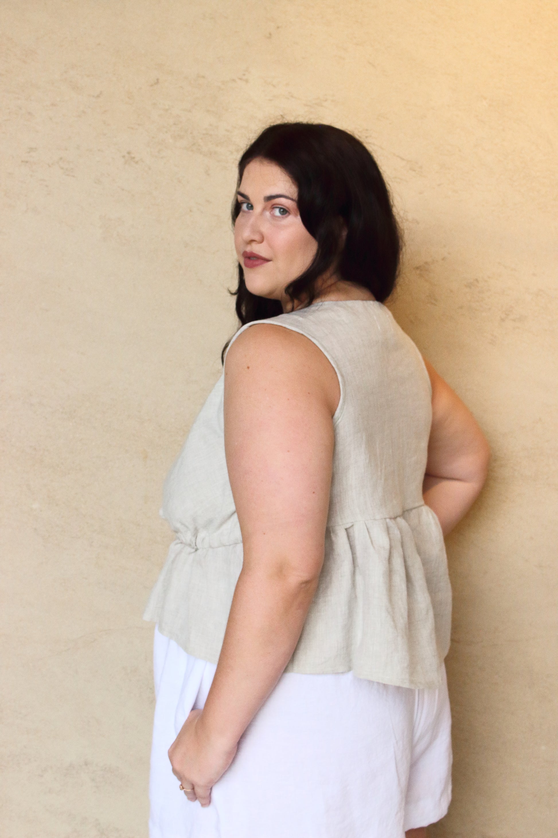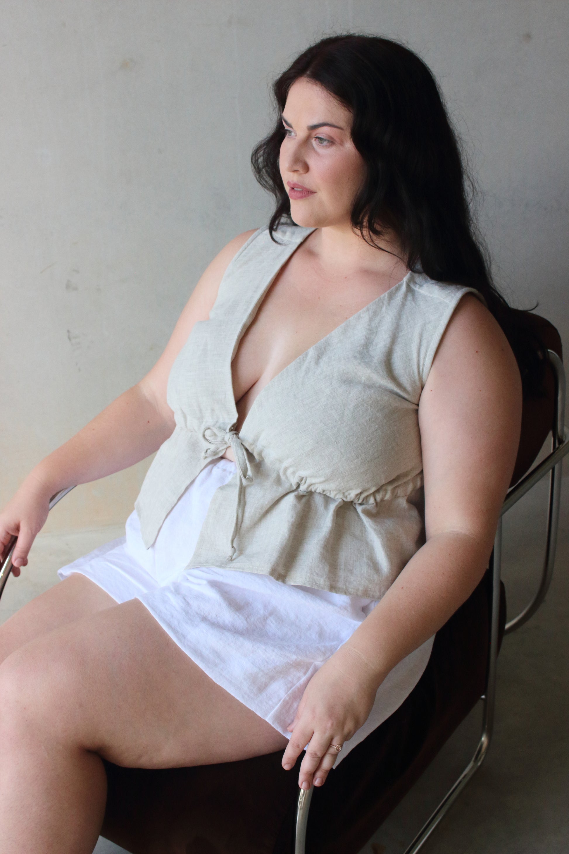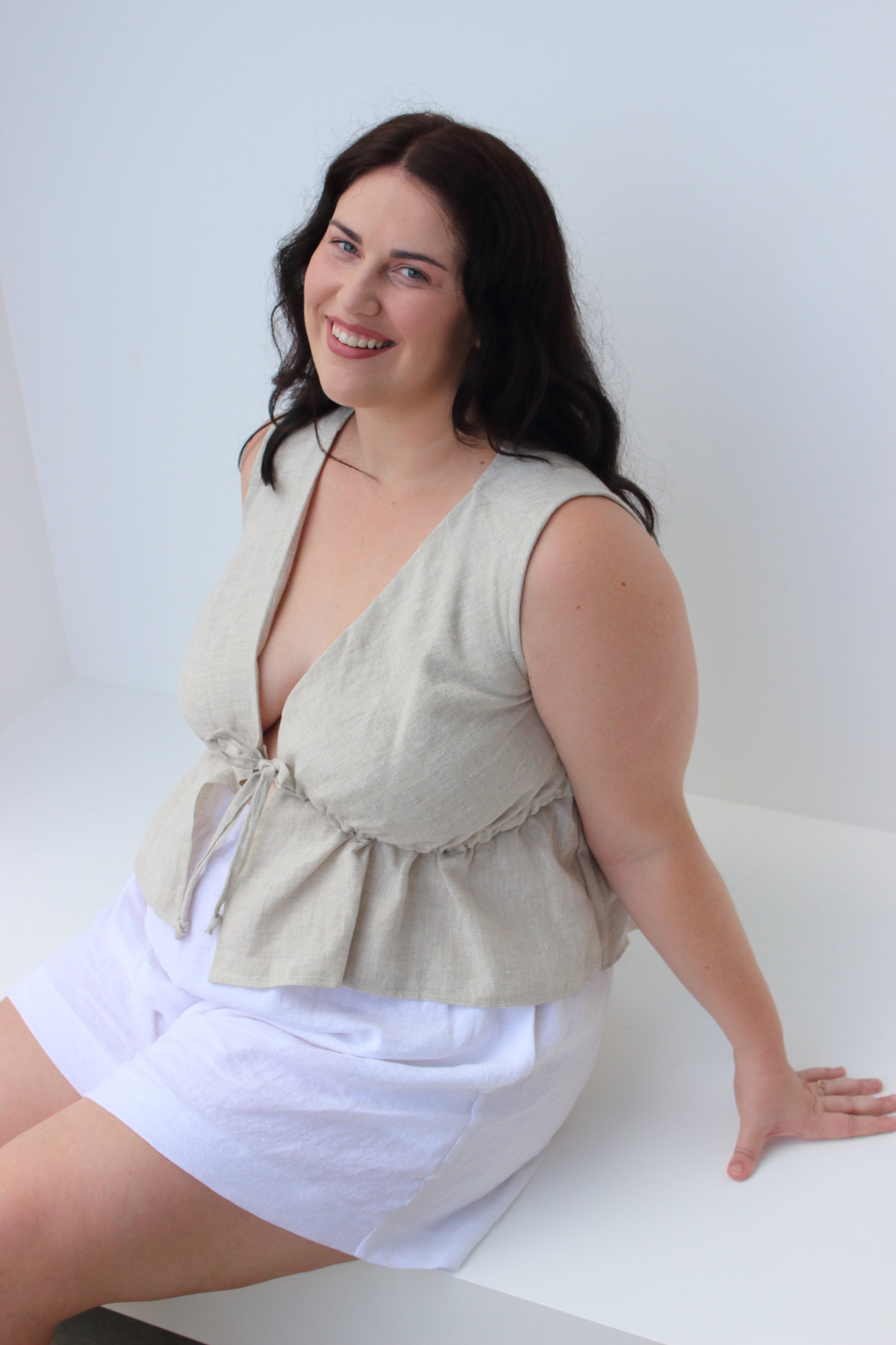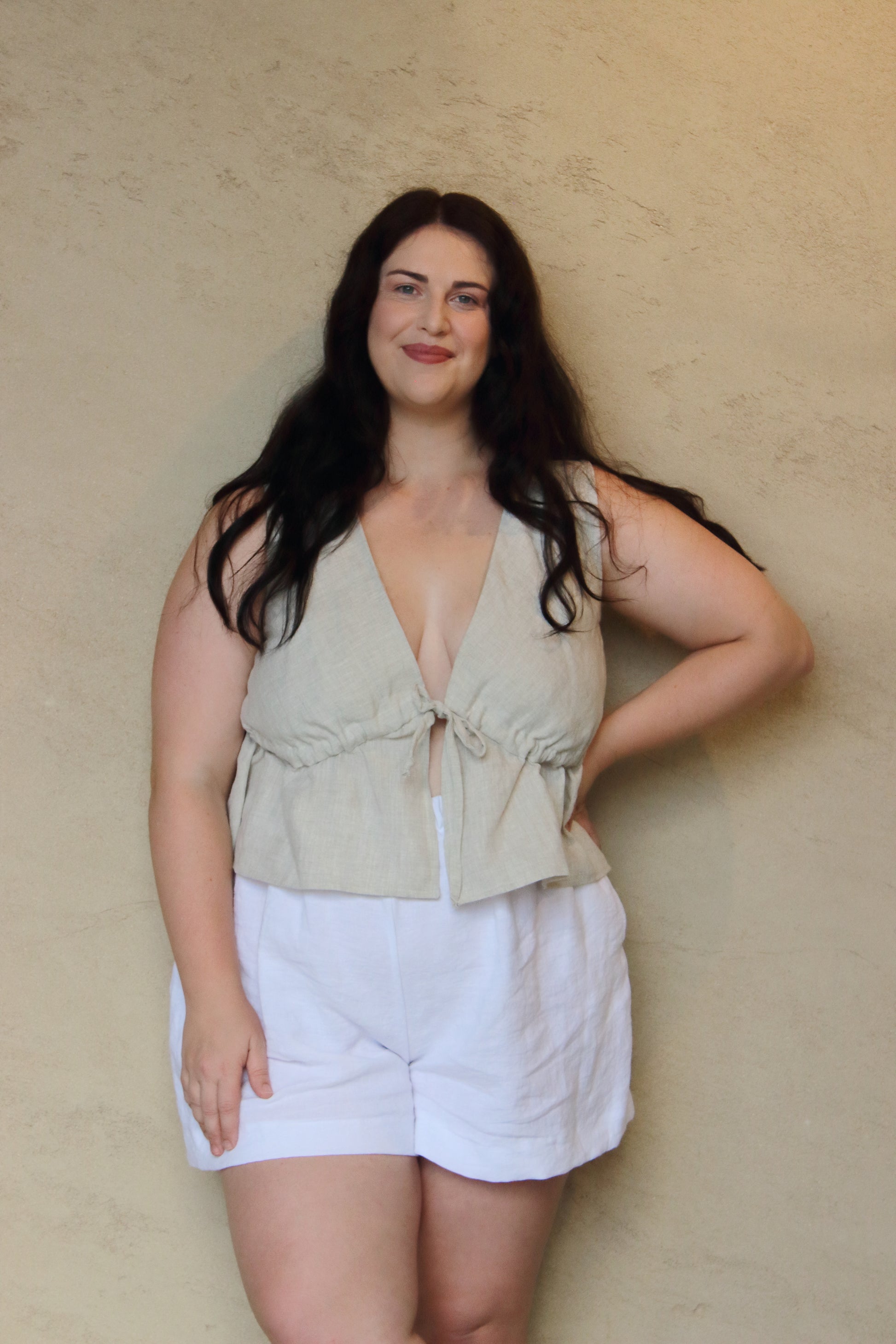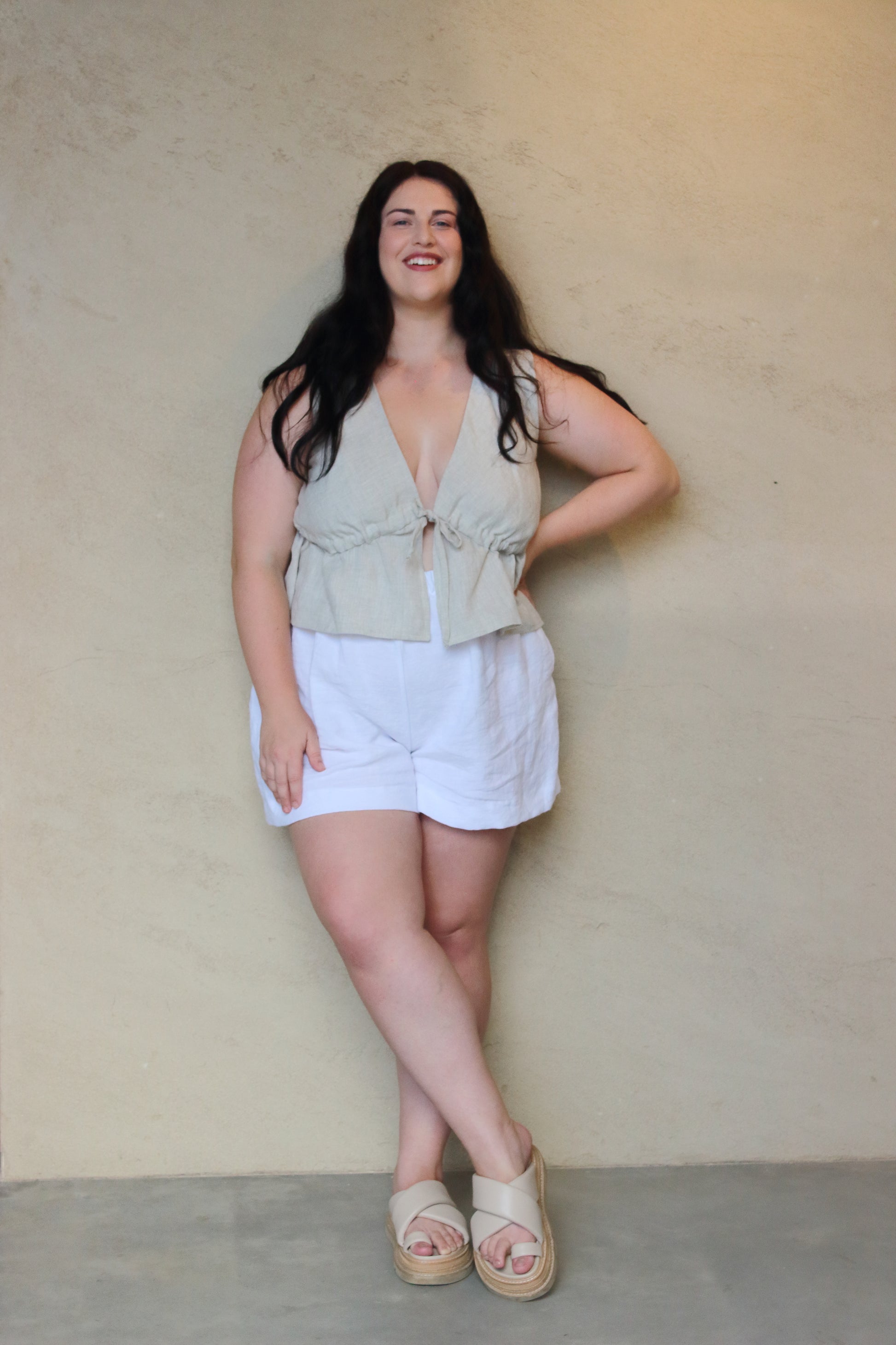 The Daria Top is an adjustable fitted top, we recommend sticking to your regular size or size up for a more oversized look.